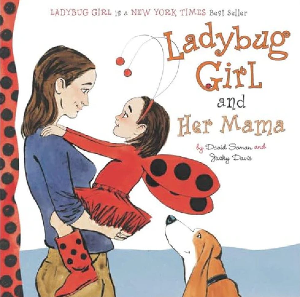 Well “about ladybugs” is a stretch. One book is called Ladybugs Do Not Go To Preschool and the other one is Ladybug Girl and Bingo, about a girl who dresses like a ladybug and her dog.